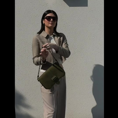 Il est composé d'une base baby Double en nubuck kaki qui lui confère structure et souplesse. Ses deux compartiments fermés par un zip permettent permettent un grand accueil des effets personnels. Il comprend une poche zippée intérieure et extérieure. Sa bandoulière ajustable de 1m25 permet un porté crossbody ou épaule.